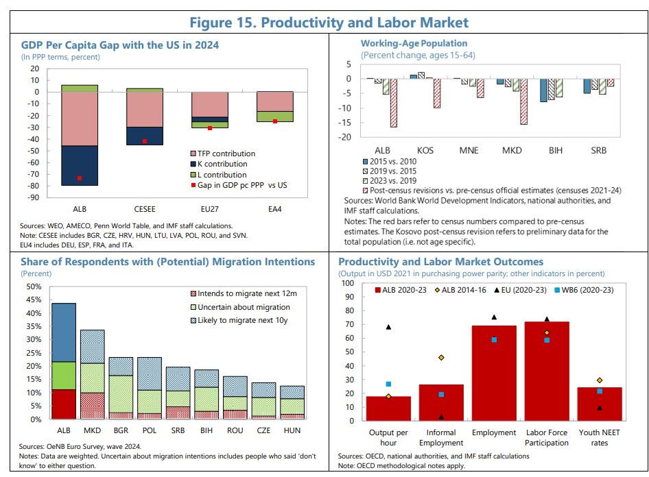 Analizat e stafit e stafit të FMN tregojnë se një paketë gjithëpërfshirëse reformash që rrit produktivitetin është kyçe për përshpejtimin e rritjes ekonomike dhe zbutjen e efekteve negative të migracionit. Ndërsa përpjekjet e qeverisë për rritjen e pagave përmes rritjeve të përsëritura të pagës minimale mund të ofrojnë lehtësim afatshkurtër, ato nuk janë të qëndrueshme pa rritje përkatëse të produktivitetit./B.Hoxha