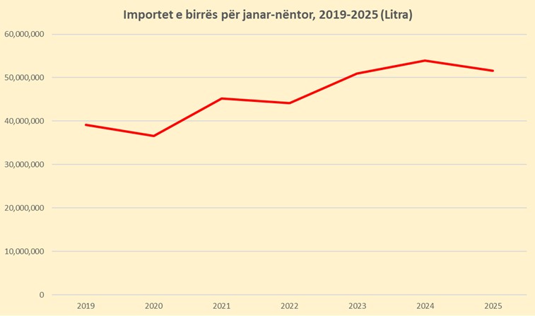 Ndërsa importet e birrës vijojnë të jenë me rënie, e cila nisi që në muajin korrik 2025 sipas të dhënave të Doganave.