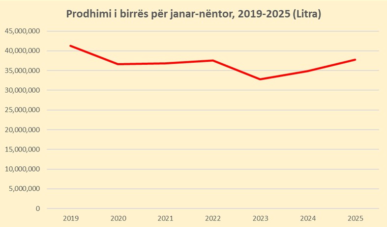 Ndërsa për 11 mujorin 2025 sipas të dhënave të Doganave u prodhua një sasi prej  37,7 mln litra birrë. Krahasuar me të njëjtën periudhë të vitit të kaluar, prodhimi është rritur 8%,  duke qëndruar në nivelet më të larta pas periudhës së pandemisë së Covid-19.