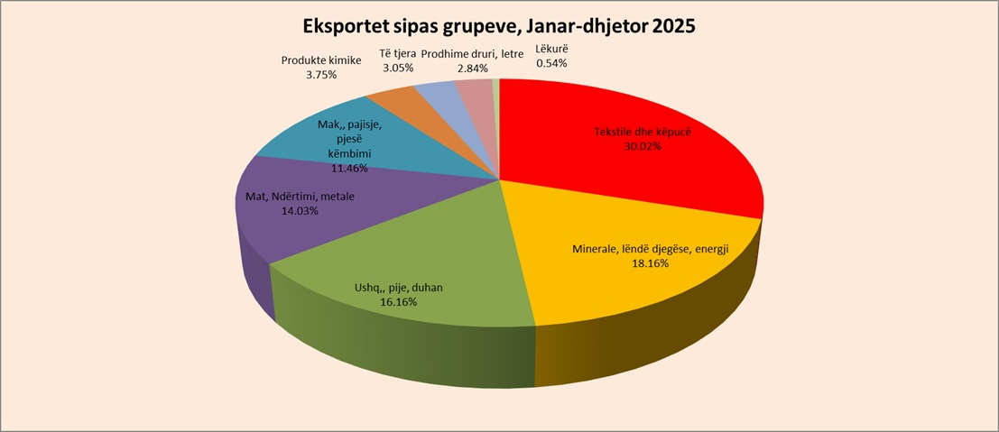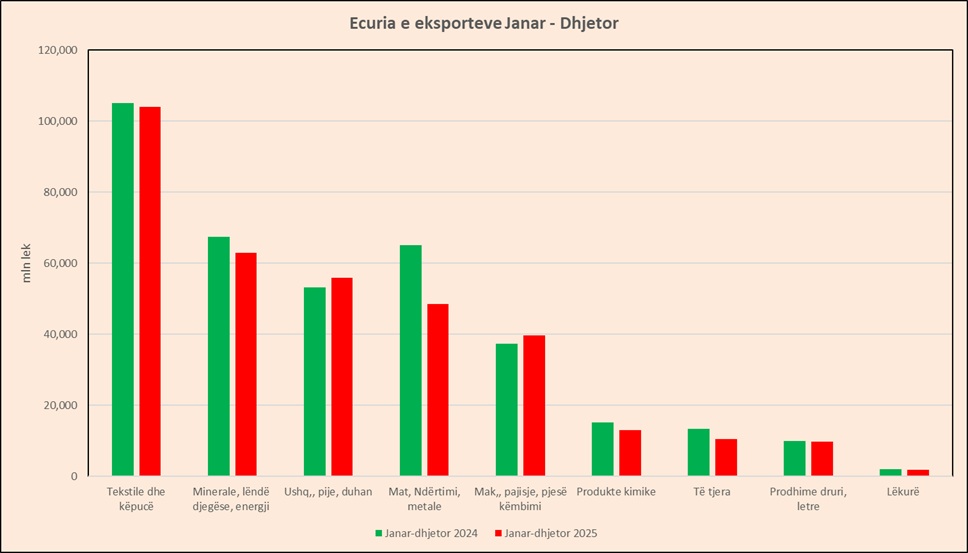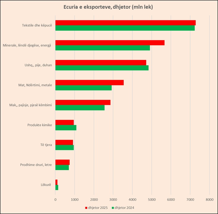 Vetëm dy grupe kanë pasur tendencë pozitive në 2025-n. Sipas INSTAT, Eksportet, gjatë vitit 2025 janë ulur me 6,1 %, krahasuar me një vit më parë. Grupet që kanë ndikuar në uljen vjetore të eksporteve, janë: “Materiale ndërtimi dhe metale” me -4,5 pikë përqindje, “Minerale, lëndë djegëse dhe energji elektrike” me -1,3 pikë përqindje, etj. Ndërsa pozitivisht kanë ndikuar grupet: “Ushqime, pije, duhan” me +0,7 pikë përqindje dhe “Makineri, pajisje dhe pjesë këmbimi” me +0,6 pikë përqindje.