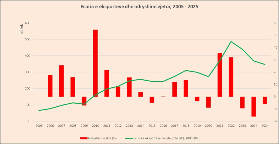 INSTAT raportoi se gjatë vitit 2025, eksportet e mallrave arritën vlerën 346 mld lekë, duke u ulur me 6,1 %. Në 2024-n, eksportet kishin rënë me 16.2% dhe në 2023-n ishin tkurrur me 9.5%.