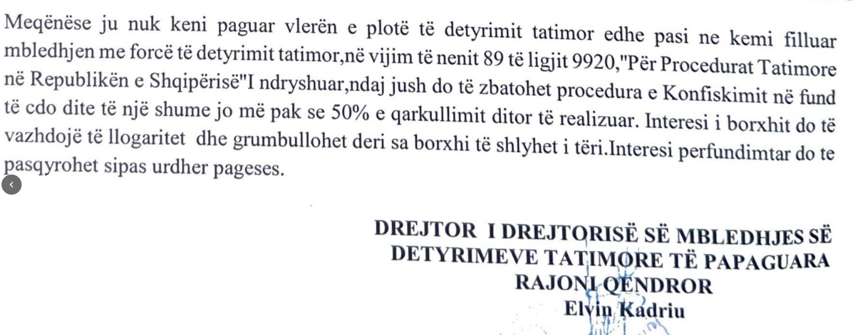 âNĂ«se nuk keni paguar vlerĂ«n e plotĂ« tĂ« detyrimit tatimor, edhe pasi ne kemi filluar mbledhjen me forcĂ« tĂ« tij, nĂ« pĂ«rputhje me nenin 89 tĂ« ligjit nr. 9920, âPĂ«r Procedurat Tatimore nĂ« RepublikĂ«n e ShqipĂ«risĂ«â (i ndryshuar), ndaj jush do tĂ« zbatohet procedura e konfiskimit. NĂ« fund tĂ« çdo dite do tĂ« konfiskohet njĂ« shumĂ« prej sĂ« paku 50% tĂ« qarkullimit ditor tĂ« realizuar. Interesi i borxhit do tĂ« vazhdojĂ« tĂ« llogaritet dhe grumbullohet deri nĂ« shlyerjen e plotĂ« tĂ« tij. Interesi pĂ«rfundimtar do tĂ« pasqyrohet nĂ« urdhrin e pagesĂ«sâ, thuhet nĂ« njoftimin dĂ«rguar nga administrate tatimore.
