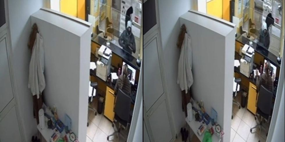 Me guxim, stafi fillon t'i godasë hajdutët me atë që duket të jetë një kuti e vogël për t'i penguar ata të marrin më shumë mallra - pa shumë sukses.