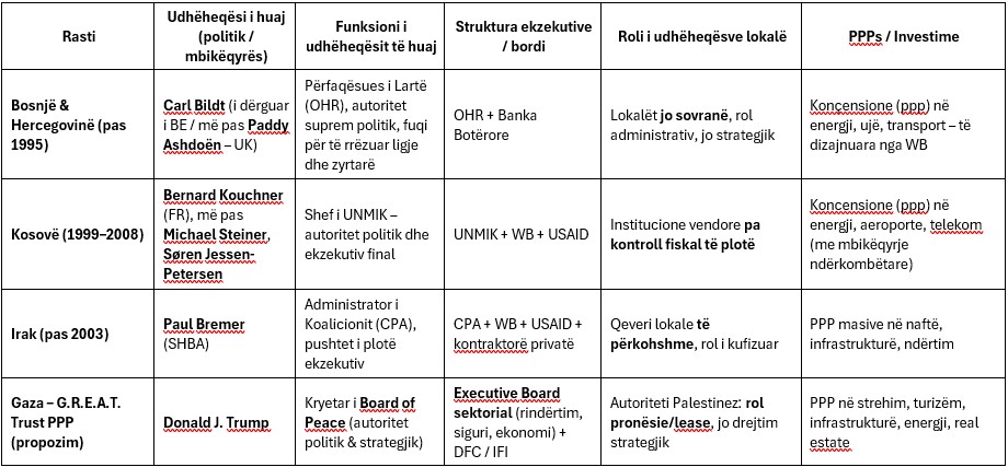 ÇfarĂ« nuk po shikohet nga askush deri mĂ« sot nĂ« botĂ« se ky model ka preçendent nĂ« botĂ«. NĂ« KosovĂ«, Presidenti Trump i vuri theksin “normalizimit ekonomik” tĂ« marrĂ«dhĂ«nieve mes KosovĂ«s dhe SerbisĂ« si masĂ« pĂ«r uljen e tensioneve politike. Po ashtu gjatĂ« vizitĂ«s nĂ« Kore tĂ« Veriut tha se po shikonte „beach front property“. PĂ«rveç kĂ«saj, modeli PPP nĂ« zona post-konflikti Ă«shtĂ« pĂ«rdorur mĂ« herĂ«t nĂ« disa raste si nĂ« tabelĂ«n mĂ« poshtĂ« nĂ« Bosnje, Kosove dhe Irak. NĂ« tĂ« tre kĂ«to konflikte Tony Blair ka qenĂ« nĂ« pushtet dhe me ndikim politik pĂ«rkatĂ«s: