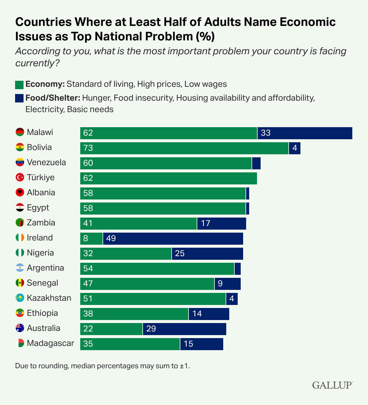Tri vendet e para në këtë listë i përkasin rajoneve dhe konteksteve të ndryshme ekonomike, nga pasiguria e lartë ushqimore në Malawi, te kolapsi ekonomik i Venezuelës në kushtet e krizës politike dhe vështirësitë e Bolivisë me inflacionin, por të gjitha kanë të përbashkët një popullsi që i vendos shqetësimet ekonomike mbi çdo problem tjetër.