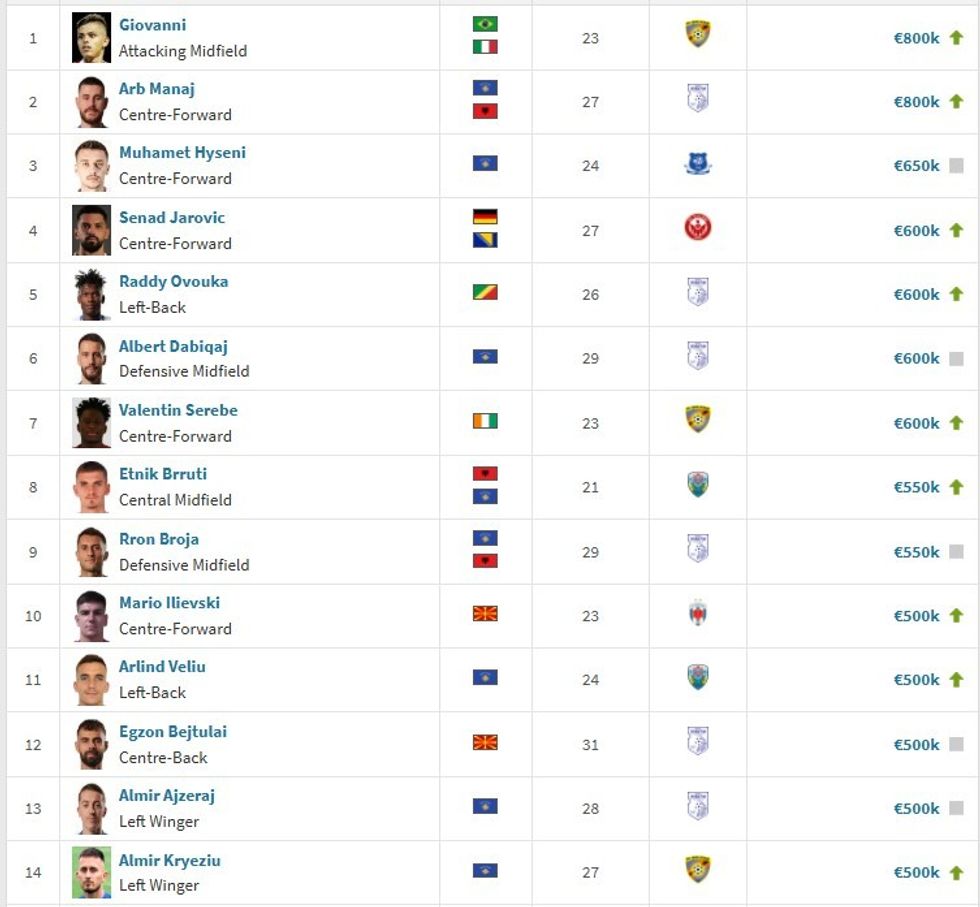 Sipas faqes së specializuar të transferimeve dhe statistikave Transfermarkt, mesfushori i Ballkanit, Giovanni dhe sulmuesi i Dritës, Arb Manaj janë lojtarët më të vlefshëm me vlerë prej 800 mijë eurosh.