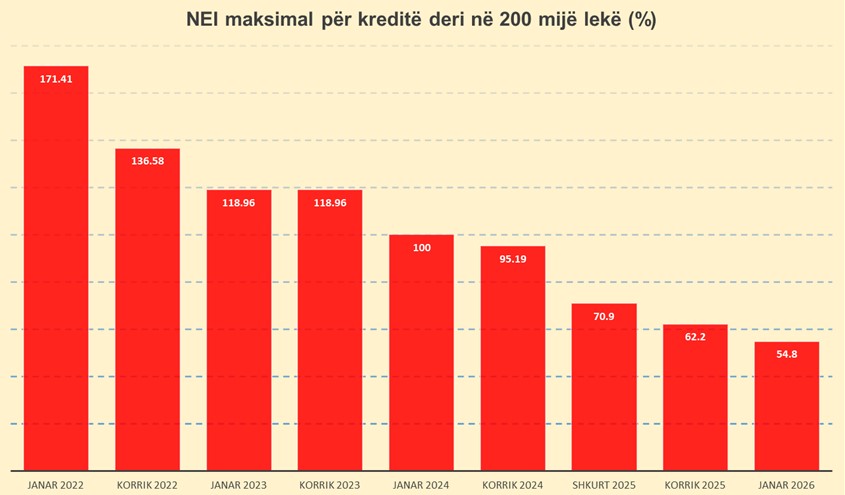 Sipas normave të reja të miratuara nga Banka e Shqipërisë, për kreditë konsumatore me vlerë deri në 200 mijë lekë, institucionet financiare nuk mund të aplikojnë normë efektive interesi më të lartë se 54.8%, nga 62.2% që kishte qenë në gjysmën e dytë të vitit 2025 dhe nga 70.9% që kishte qenë një vit më parë.