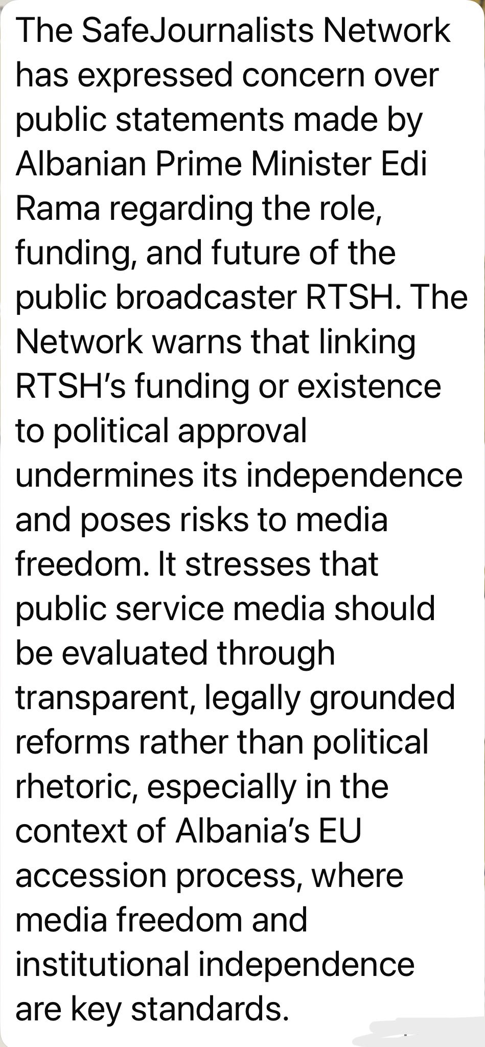 I ftoj autorët e kësaj deklarate keqorientuese ta lexojnë ose ta dëgjojnë me kujdes fjalimin tim dhe të bëjnë një përpjekje të sinqertë për të kuptuar thelbin. Vërejtjet e mia nuk kanë të bëjnë absolutisht aspak me “lidhjen e financimit apo të ekzistencës së RTSH-së me miratimin politik”. Çdo interpretim i tillë është thjesht i pasaktë dhe keqorientues.
