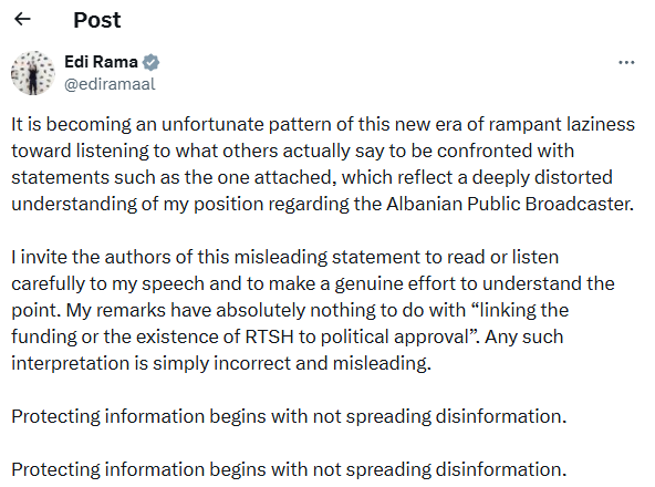 Kryeministri Edi Rama ka reaguar ndaj deklaratës që sipas tij shtrembëron qëndrimin e tij lidhur me RTSH-në. Në një reagim të publikuar në platformën X, kreu i qeverisë shqiptare shprehet se po krijohet një model shqetësues i keqinformimit dhe i mungesës së vullnetit për të dëgjuar realisht atë që thuhet. Rama thekson se vërejtjet e tij nuk kanë absolutisht asnjë lidhje me një qasje të tillë dhe se thelbi i fjalimit të tij është keqkuptuar ose deformuar. Ai u bën thirrje autorëve të deklaratës që të lexojnë ose të dëgjojnë me kujdes fjalimin e tij dhe të bëjnë një përpjekje të sinqertë për të kuptuar mesazhin real.