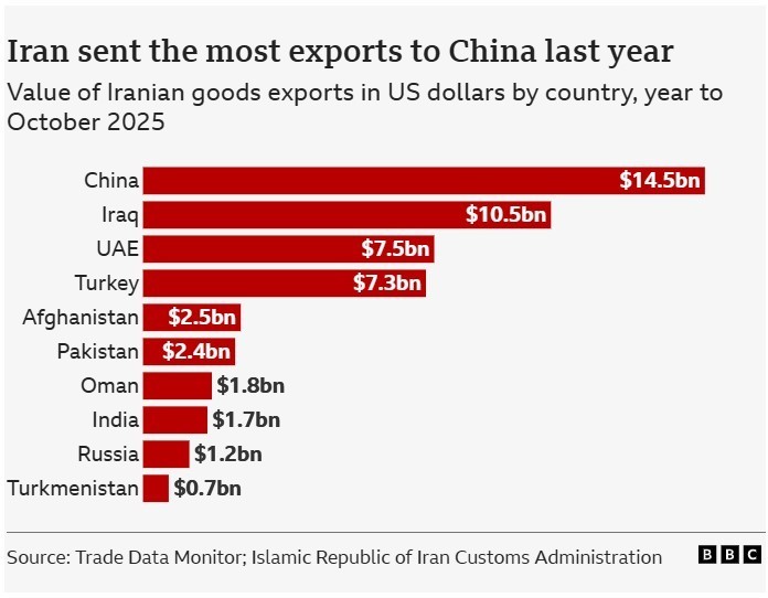Gjatë vitit deri në tetor 2025, ajo bleu më shumë se 14 miliardë dollarë (rreth 12 miliardë euro) produkte nga Irani, sipas shifrave nga Monitori i të Dhënave Tregtare, të cilat bazohen në statistikat nga Administrata Doganore e Republikës Islamike të Iranit.