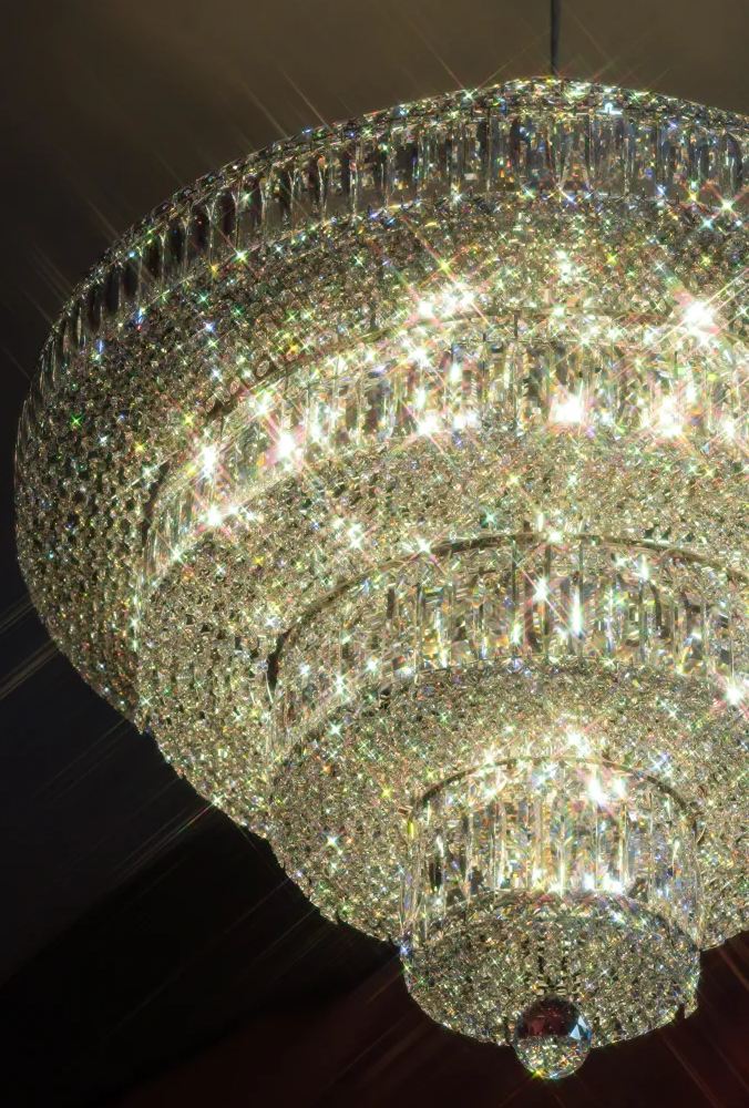 Shandanët ishin të përbërë nga shtresa elegante prismash të prera me saktësi absolute, ku kristalet katrore, drejtkëndëshe dhe tetëkëndëshe shpërndanin dritën në mënyrë të butë dhe luksoze. Tre prej instalacioneve kishin një diametër rreth 90 centimetra dhe përmbanin nga 4 mijë kristale secila, ndërsa një tjetër qendrore, më monumentale, me diametër rreth 150 centimetra, mbante afro 10 mijë kristale. Në total, rreth 25 mijë kristale dhe 150 orë punë artizanale u shndërruan në një simbol të pastër elegance dhe mjeshtërie.