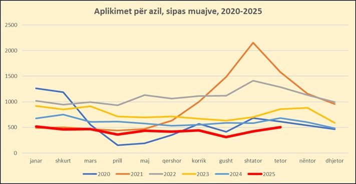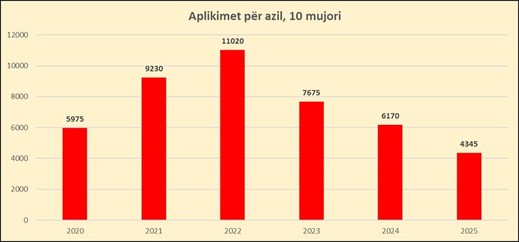 Pavarësisht rritjes së tetorit, për 10 mujorin 2025, aplikimet për mbrojtje ndërkombëtare kanë qenë në rënie. Për periudhën janar-tetor ishin gjithsej 4345 persona që kërkuan azil, me një rënie prej 29.5% në krahasim me të njëjtën periudhë të një viti më parë.