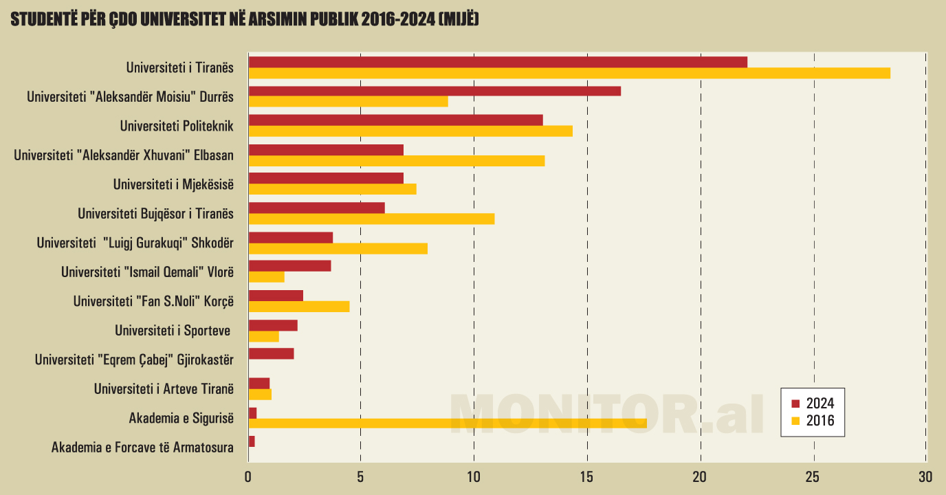 Në të kundërt, degët strategjike për shtetin dhe ekonominë reale po lihen pas dore në mënyrë sistematike. Në krye të kësaj liste janë degët e mësuesisë, të cilat përbëjnë sot një rrezik real për sigurinë arsimore të vendit në afatin e mesëm dhe të gjatë.