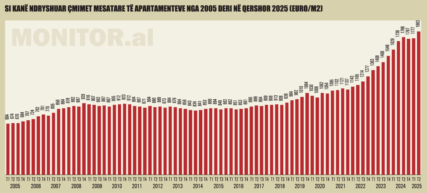 NĂ« krahasim me 2005-n, viti mĂ« i hershĂ«m kur ka filluar llogaritja, çmimet janĂ« 2.8 herĂ« mĂ« tĂ« larta. Ămimi mesatar i apartamenteve nĂ« 20 vite Ă«shtĂ« gati trefishuar krahasuar me vitin 2005.