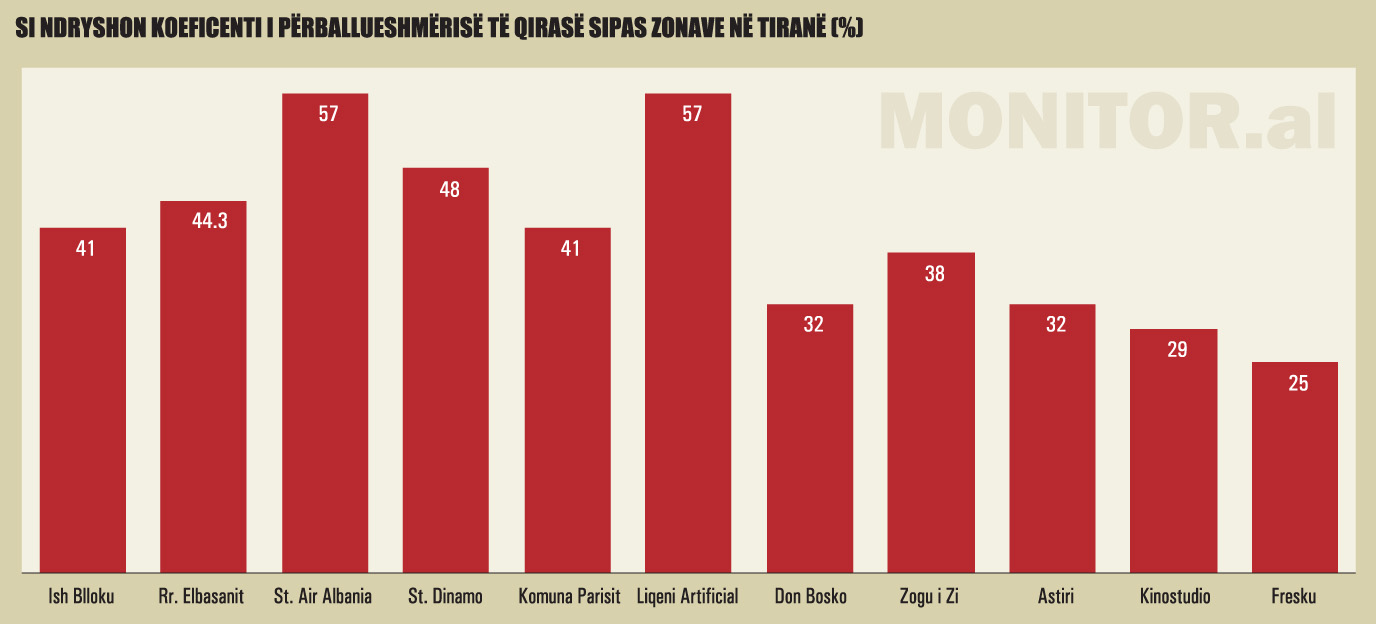 NdĂ«rsa pĂ«r zona si ish-Blloku, Komuna e Parisit, Liqeni Artificial, Rruga e Elbasanit apo stadiumi âAir Albaniaâ, koeficienti i pĂ«rballueshmĂ«risĂ« llogaritet mbi 40%.