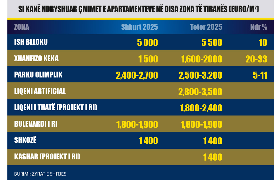 Sipas njĂ« vĂ«zhgimi nĂ« terren tĂ« âMonitorâ brenda nĂ«ntĂ« muajve nĂ« 2025, çmimet e apartamenteve nĂ« TiranĂ« kanĂ« shĂ«nuar rritje tĂ« ndjeshme, ku zonat me shtrenjtimin mĂ« tĂ« shpejtĂ« rezultojnĂ« tĂ« jenĂ« ish-Blloku, pranĂ« Liqenit Artificial, Porcelani dhe zona pranĂ« Parkut Olimpik.