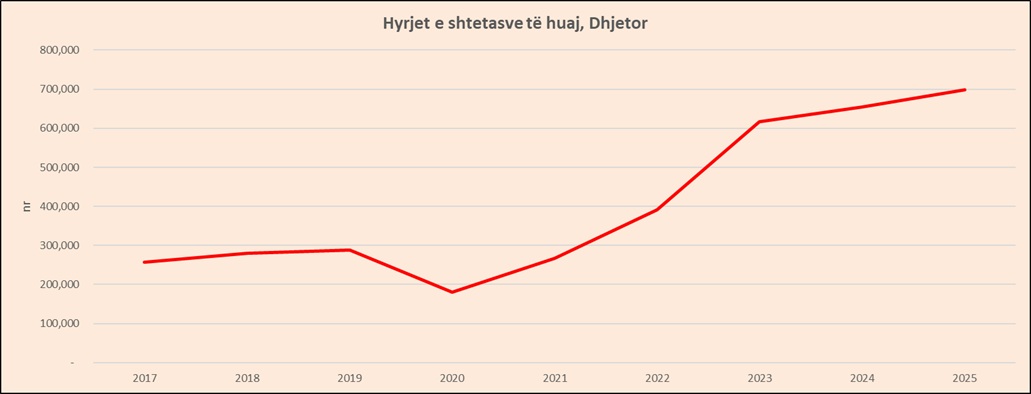 “Daljet e shtetasve tĂ« huaj nga territori i ShqipĂ«risĂ« gjatĂ« muajit Dhjetor 2025 janĂ« 638.680. Krahasuar me tĂ« njĂ«jtĂ«n periudhĂ« tĂ« njĂ« viti mĂ« parĂ«, ky tregues Ă«shtĂ« rritur me 5,5%