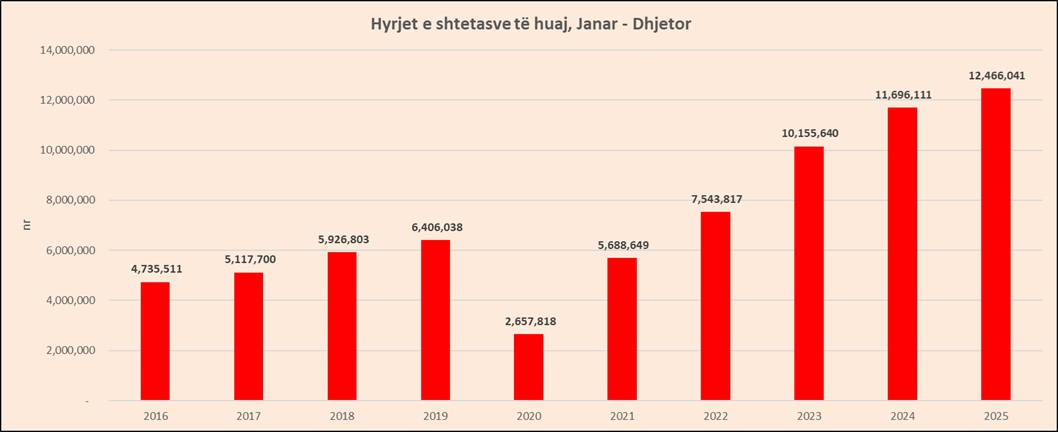 NĂ« Dhjetor 2025, numri i shtetasve shqiptarĂ« qĂ« kanĂ« hyrĂ« nĂ« territorin shqiptar Ă«shtĂ« 844.147, duke pĂ«suar njĂ« rritje me 7,1%, krahasuar me Dhjetor 2024. Numri i shtetasve tĂ« huaj qĂ« kanĂ« hyrĂ« nĂ« territorin shqiptar Ă«shtĂ« 698.742. Ky numĂ«r Ă«shtĂ« rritur me 6,8%, krahasuar me tĂ« njĂ«jtĂ«n periudhĂ« tĂ« vitit 2024”, thuhet nĂ« publikimin e INSTAT.