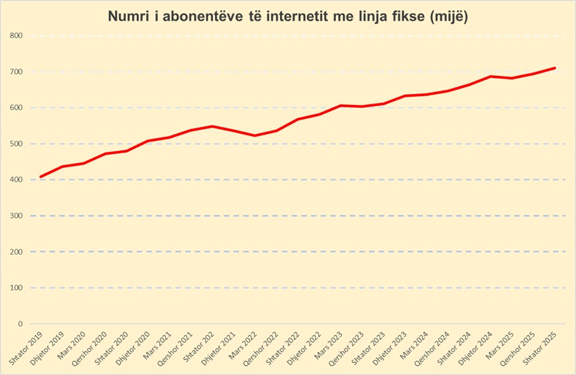Të dhënat e Autoritetit të Komunikimeve Elektronike dhe Postare (AKEP) tregojnë se numri i abonentëve në fund të muajit shtator 2025 arriti në rreth 710 mijë, në rritje me 2.4% krahasuar me tremujorin e mëparshëm dhe 7.1% krahasuar me të njëjtën periudhë të një viti më parë.