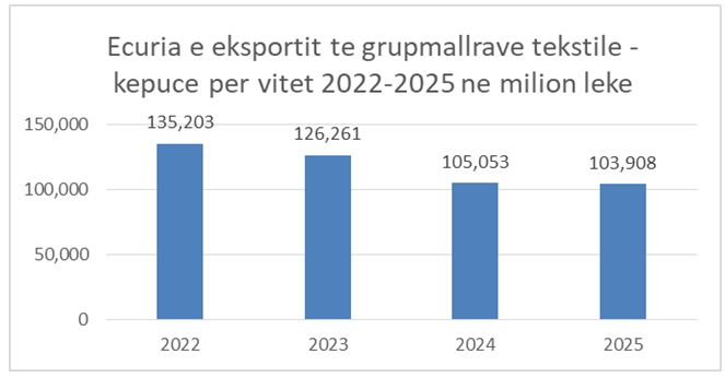 NdĂ«rsa pĂ«rsa i pĂ«rket grupmallrave tekstile â kĂ«pucĂ« tĂ« prezantuar dhe nĂ« grafikun nr 3 , vihet re se nga njĂ« vĂ«llim nĂ« vlerĂ« prej 135 miliard lekĂ«, nĂ« vitin 2022, ato kanĂ« rĂ«nĂ« nĂ« 126 miliard lekĂ« nĂ« vitin 2023, nĂ« 105 miliard lekĂ« nĂ« vitin 2024 dhe 103.9 miliard lekĂ« nĂ« vitin 2025. Pra rĂ«nia pakĂ«simi i eksporteve gjatĂ« 3 vjetĂ«ve Ă«shtĂ« 31 miliard lekĂ« dhe nĂ« kushtet e rritjes sĂ« kostove tĂ« prodhimit Ă«shtĂ« shoqĂ«ruar me uljen e dukshme tĂ« fitimit tĂ« degĂ«s, falimentimin e mjaft firmave dhe shkurtimin e rreth 8 mijĂ« punĂ«torĂ«ve. Nuk Ă«shtĂ« e tepĂ«rt tĂ« evidentohet se rĂ«nia e dukshme gjatĂ« vitit 2023 e 2024, ka ndodhur edhe nĂ« kushtet kur paga minimale zyrtare nuk ka ndryshuar nga Prilli I vitit 2023 deri nĂ« fund tĂ« vitit 2025.