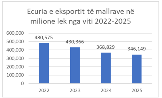 Si në grafikun nr 2 për eksportin e mallrave gjithsej ashtu dhe në grafikun nr 3 për eksportin e grup mallrave tekstile këpucë, vihet re rënia e vazhdueshme e tyre, respektivisht në Grafikun Nr 2 nga 480 miliard lekë në vitin 2022, në 430 miliard lekë në vitin 2023, në 368 miliard lekë në vitin 2024, për të arritur në 346 miliard lekë në vitin 2025.