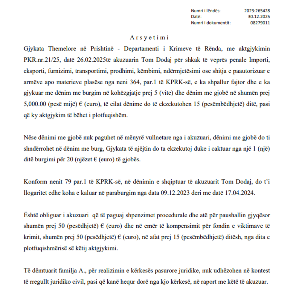 Sipas vendimit të Apelit që është marrë më 30 dhjetor 2025, Dodaj është dënuar me burgim në kohëzgjatje prej 3 vjetësh dhe me një gjobë prej 3,000 euro, të cilat do të ekzekutohen pas plotfuqishmërisë së aktgjykimit.