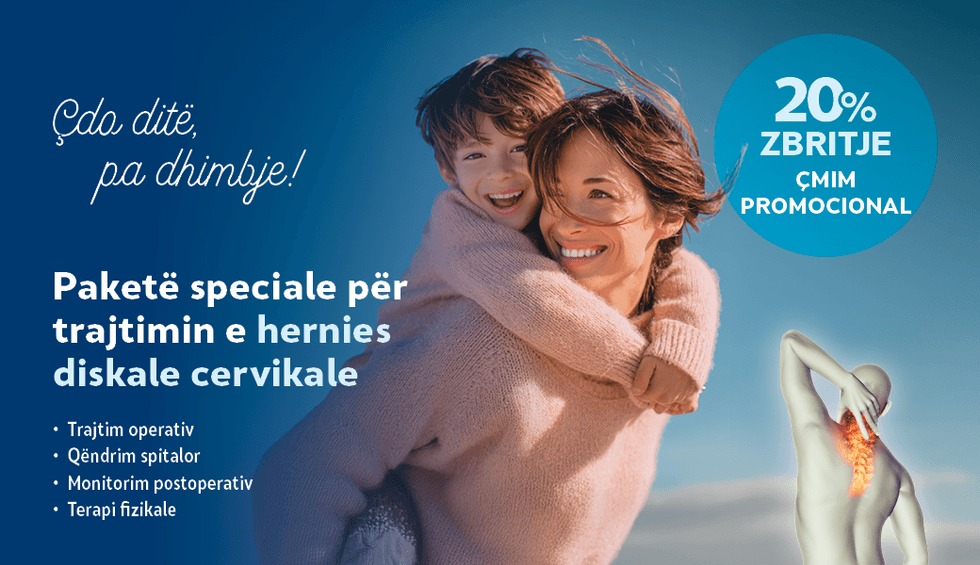 Spitali Klinik âAcibadem Sistinaâ ofron njĂ« paketĂ« speciale pĂ«r trajtimin operativ tĂ« hernies diskale nĂ« qafĂ« (cervikale) me njĂ« zbritje prej 20%. Paketa ofron trajtim tĂ« plotĂ« dhe rehabilitim tĂ« pacientit dhe pĂ«rfshin: ndĂ«rhyrjen operative, qĂ«ndrimin spitalor, tĂ« gjitha analizat laboratorike, monitorimin postoperativ tĂ« pacientit dhe terapi fizikale nĂ« qendrĂ«n sportive âPremiumâ. NdĂ«rhyrjet realizohen nga njĂ« ekip neurokirurgĂ«sh me pĂ«rvojĂ«, duke zbatuar teknika bashkĂ«kohore kirurgjikale dhe duke pĂ«rdorur pajisje mjekĂ«sore moderne.