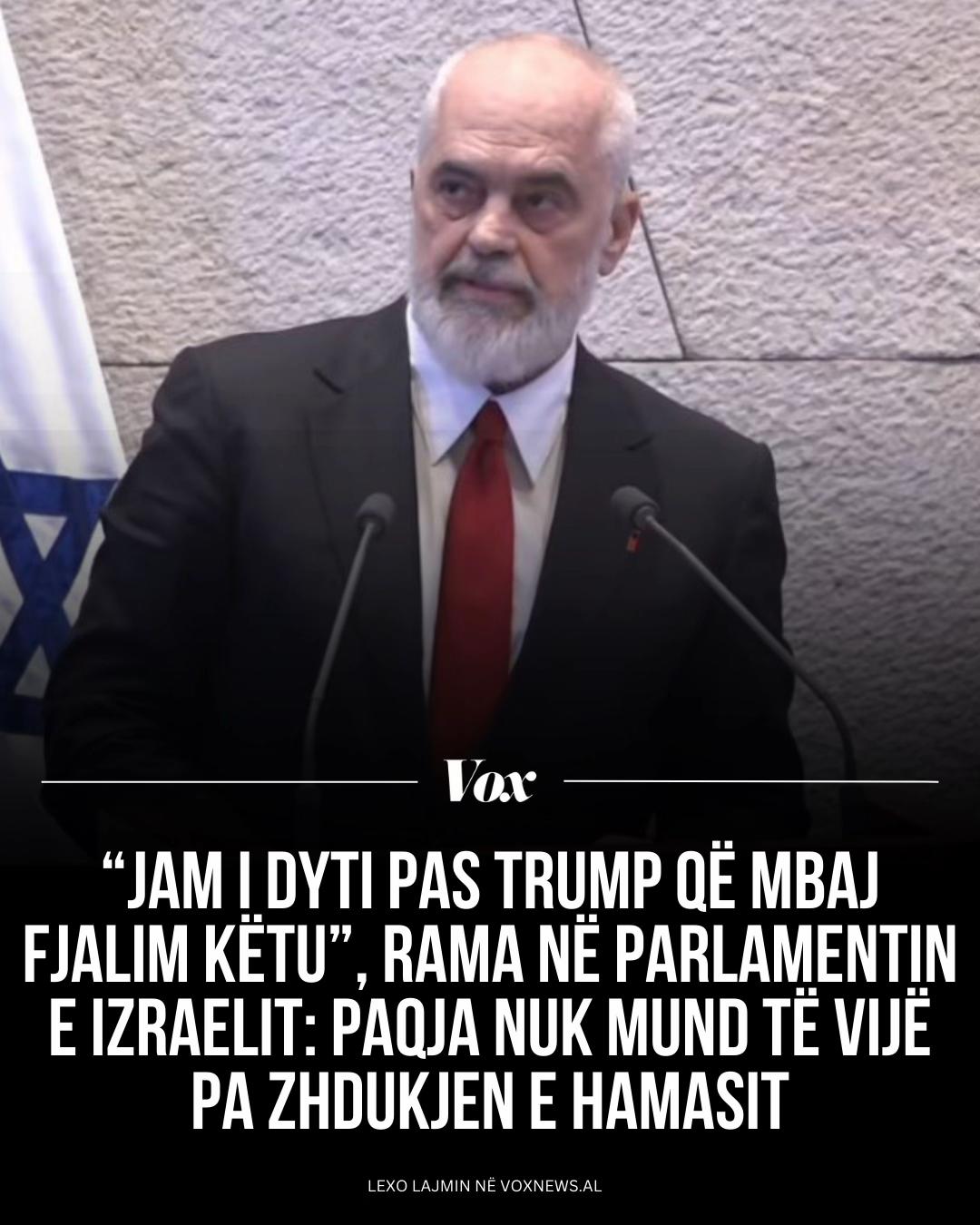 Kryeministri Edi Rama vijuar fjalimin e tij në parlamentin izraelit, Knesset, ku u ndal te zhvillimet në Lindjen e Mesme dhe qëndrimi i Shqipërisë lidhur me konfliktin Izrael-Hamas. Rama shkëmbeu batuta duke u shprehur se do të bëjë më të mirën në fjalimin e tij për t’i mbijetuar gjykimit të Netanyahut. Ai theksoi se është i dyti si spiker ndërkombëtar pas presidentit amerikan Donald Trump. “Unë do bej me te mirën për t'i mbijetuar gjykimit tënd, jam i dyti spiker ndërkombëtar pas Trump që mbaj fjalim këtu. Me lejoni me një fryme të thjesht, te jap vlerësimin tim me të madh dhe falënderimet e sinqerta për Shqipërinë dhe veten time, mirënjohjen time për këtë ftese”, tha ai. Në deklaratat e tij, kryeministri u shpreh se përgjegjësia për dhunën i takon Hamasit. “Xhelati është Hamasi dhe askush tjetër”, tha Rama, duke e cilësuar organizatën si bartëse të një ideologjie terrori, që sipas tij vepron si kundër palestinezëve, ashtu edhe kundër popullit hebre. Rama theksoi se ideologjia e Hamasit përfaqëson një dogmë totalitare dhe se, sipas tij, pa çarmatosjen dhe çmontimin e plotë të kësaj organizate, nuk mund të ketë një paqe të qëndrueshme në rajon. “Derisa Hamasi të çarmatoset dhe të çmontohet, asnjë paqe nuk do të zgjasë dhe nuk mund të arrihet”, u shpreh kryeministri shqiptar. #voxnews #media #news