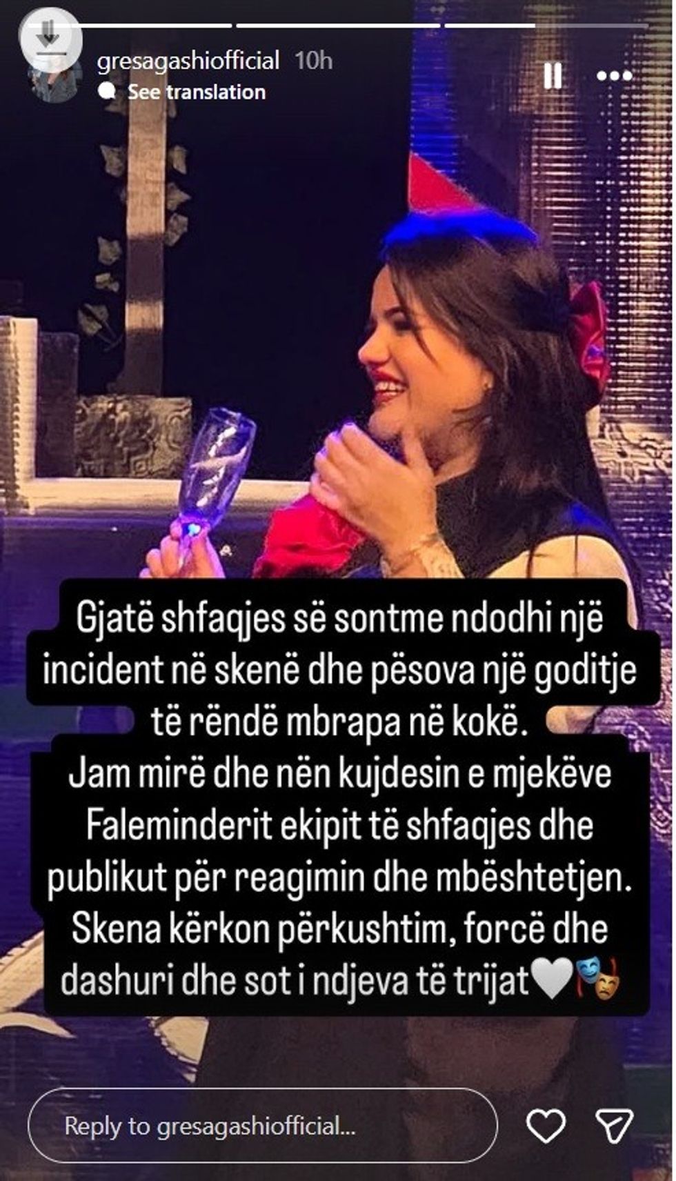 âJam mirĂ« dhe nĂ«n kujdesin e mjekĂ«ve. Faleminderit ekipit tĂ« shfaqjes dhe publikut pĂ«r reagimin dhe mbĂ«shtetjenâ, ka shkruar ajo, duke shprehur mirĂ«njohje pĂ«r solidaritetin dhe pĂ«rkrahjen e treguar pas incidentit.
