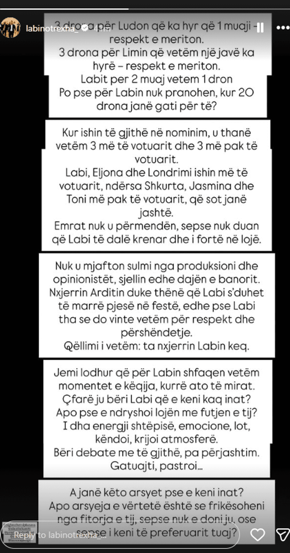 Kanë reaguar nga Instagrami i Labinot Rexhës për disa gjëra kundrejt tij në Big Brother, që sipas tyre janë padrejtësi.