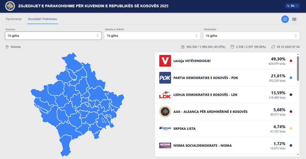 Lëvizja Vetëvendosje është fituese e Zgjedhjet të Jashtëzakonshme Parlamentare të 28 dhjetorit 2025, duke arritur të marrë 49,30 për qind apo 429, 979 vota, kur janë numëruar 99,26 për qind e kutive, përjashtuar këtu votat e diasporës, ato me kushte dhe me asistencë.