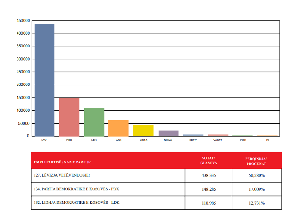 Lëvizja Vetëvendosje ka fituar 49.79 për qind, apo 421 mijë e 129 vota.