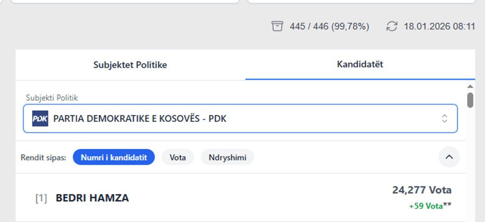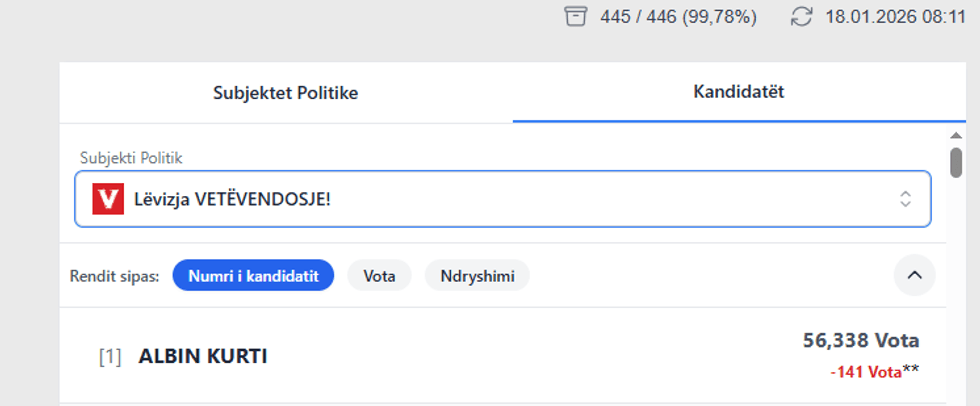 Sipas të dhënave zyrtare, Albin Kurti nga LVV ka siguruar gjithsej 56,338 vota, ndërsa nga rinumërimi është shënuar një ulje prej 141 votash krahasuar me rezultatet paraprake.