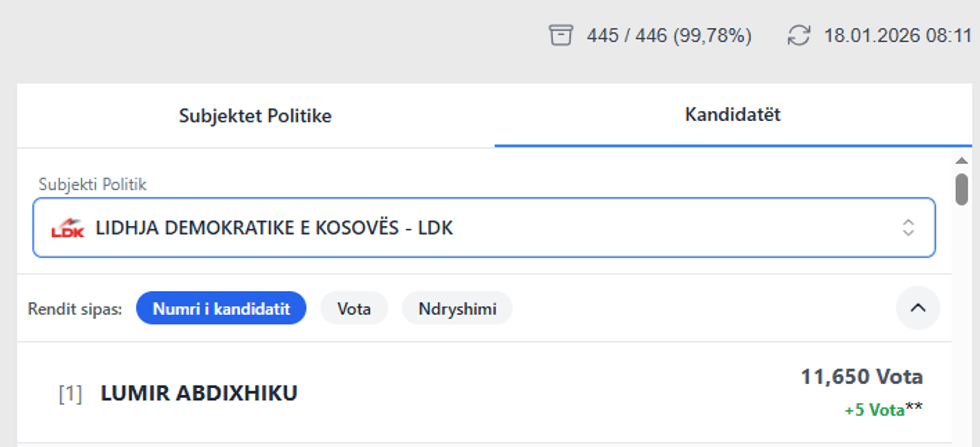 Edhe Lumir Abdixhiku nga LDK ka pasur një rritje prej 5 votave më shumë nga rinumërimi. Ai ka siguruar gjithsejt 11,650 vota.