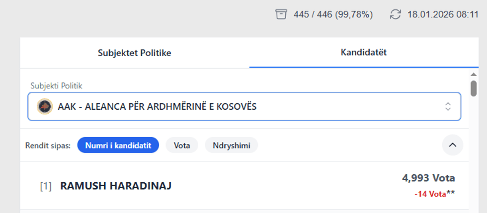 Ndërkaq humbje të votash nga procesi i rinumërimit ka pësuar edhe Ramush Haradinaj nga AAK. Ai ka 14 vota më pak, ndërsa në total numri i votave është 4,993.