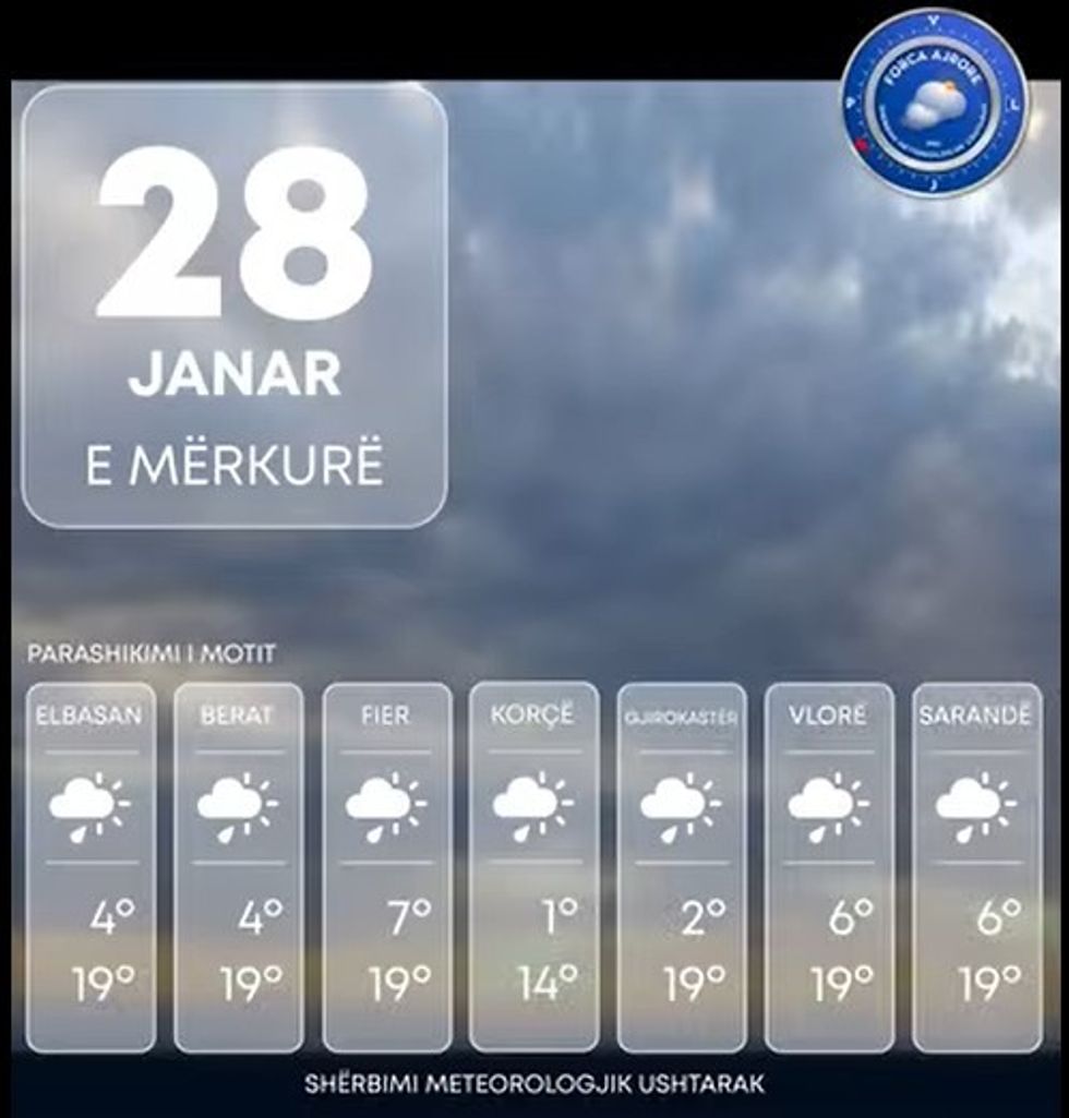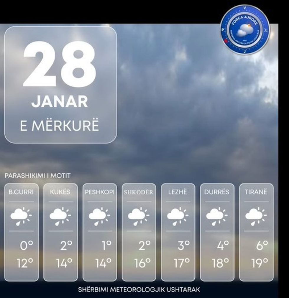 Reshjet e shiut do të bëhen prezentë në orët e mesditës me intensitet të ulët përgjatë vijës bregdetare, ndërkaq pas orëve të mesditës reshjet e shiut do të shtrihen në të gjithë vendin me intensitet të ulët deri mesatar.