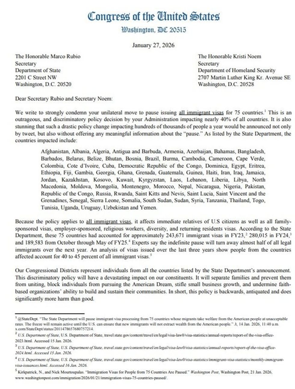 NĂ« letrĂ«n drejtuar Rubio, kongresmenĂ«t e cilĂ«suan vendimin si âskandaloz dhe diskriminuesâ, duke theksuar se ai prek rreth 40% tĂ« vendeve tĂ« botĂ«s dhe mund tĂ« ndikojĂ« te pothuajse gjysma e emigrantĂ«ve tĂ« ligjshĂ«m nĂ« Shtetet e Bashkuara.