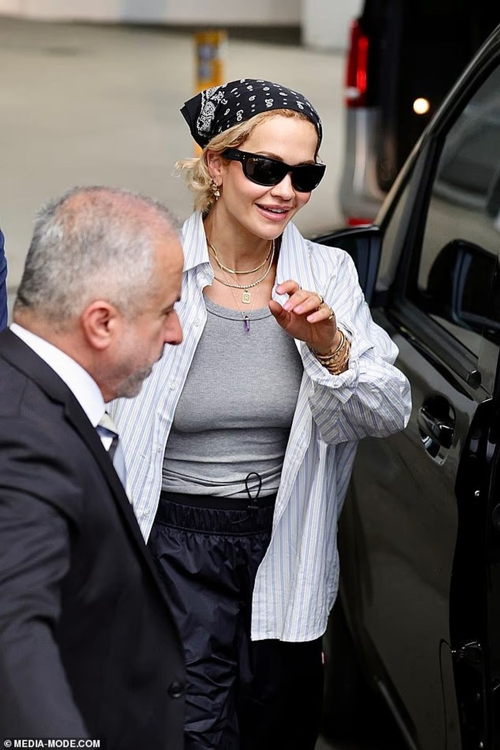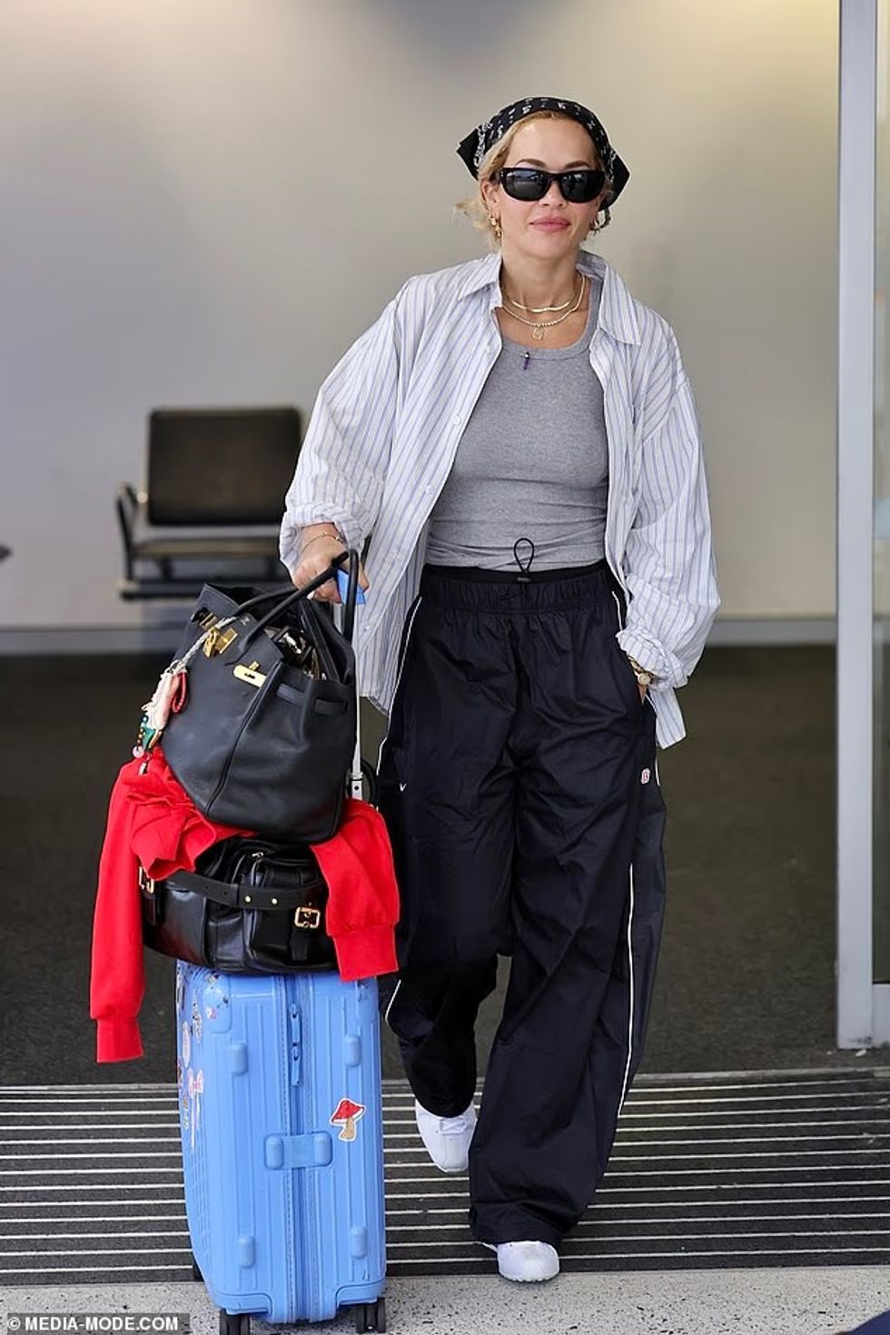 Rita kishte zgjedhur rehati për udhëtimin, duke e kompletuar paraqitjen me pantallona të zeza sportive dhe atlete të bardha Nike.