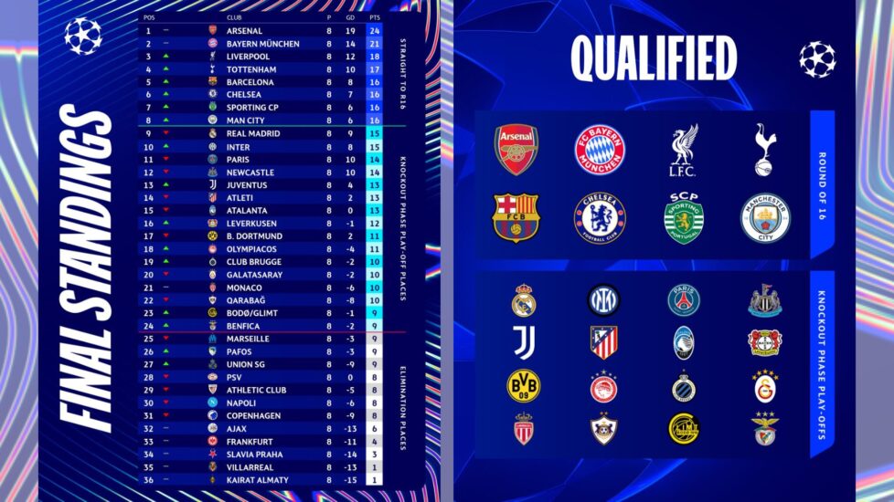 Rezultatet e raundit të 8-të Ajax 1-2 Olympiacos Arsenal 3-2 Kairat Almaty Athletic Club 2-3 Sporting CP Atletico Madrid 1-2 Bodo/Glimt Barcelona 4-1 Copenhagen Bayer Leverkusen 3-0 Villarreal Benfica 4-2 Real Madrid Borussia Dortmund 0-2 Inter Club Brugge 3-0 Marseille Eintracht Frankfurt 0-2 Tottenham Hotspur Liverpool 6-0 Qarabag Man City 2-0 Galatasaray Monaco 0-0 Juventus Napoli 2-3 Chelsea Pafos 4-1 Slavia Prague Paris Saint-Germain 1-1 Newcastle PSV Eindhoven 1-2 Bayern Munich Union SG 1-0 Atalanta