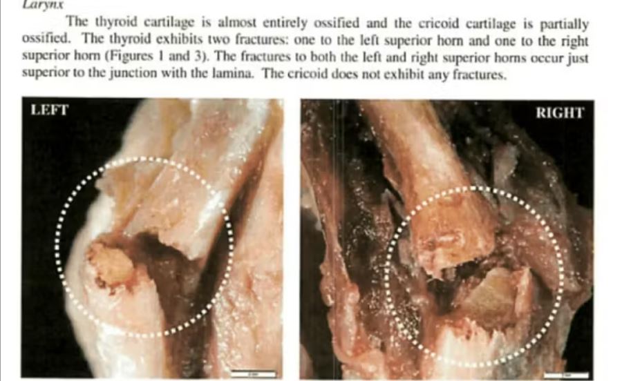 Një mavijosje me gjak është e dukshme në qafën e financierit dhe skuqja e fytyrës së tij është tregues i vdekjes nga asfiksia.