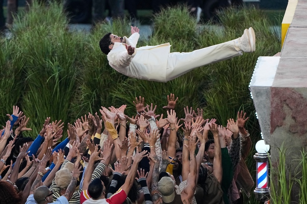 Gazeta Si â I veshur me tĂ« bardha dhe me mbiemrin e tij tĂ« stampuar nĂ« bluzĂ«, Bad Bunny hapi shfaqjen me âTitĂ Me PreguntĂłâ, duke e transformuar skenĂ«n nĂ« njĂ« rrĂ«fim vizual tĂ« atdheut tĂ« tij, mes kallamave tĂ« sheqerit, pavĂ«s tradicionale (kapelĂ«s prej kashte tĂ« Porto Rikos) dhe piraguas (njĂ« llucĂ« e AmerikĂ«s Qendrore).