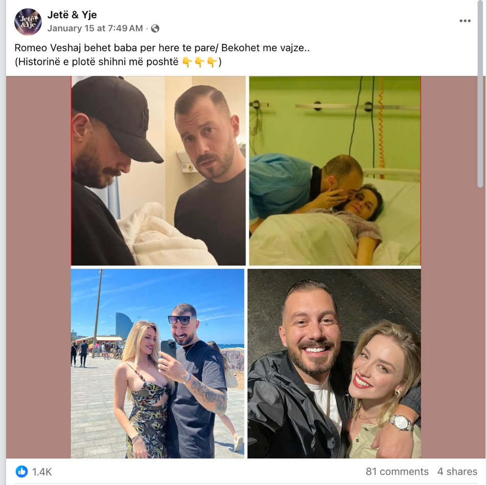Lajmi se aktori Romeo Veshaj është bërë baba për herë të parë ka ngjallur interes të lartë te lexuesit. Pretendimi (link, link, link) shoqërohet me disa fotografi ku Veshaj shihet duke mbajtur në krahë një foshnjë të porsalindur, si edhe me imazhe të tij së bashku me Heidi Bacin, partneren e tij prej edicionit të Big Brother Vip 3. Gjatë ditëve të para pas publikimit në Facebook, figurojnë mbi 195 mijë shikime të këtij njoftimi për çiftin e dashur të ekranit. Megjithatë, ky pretendim që do ketë gëzuar shumë nëna shqiptare, nuk është i saktë.
