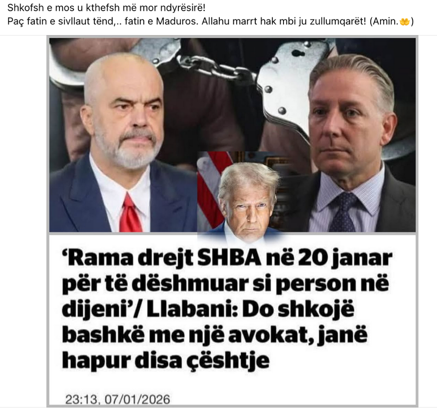 Që nga arrestimi i Maduro me datë 3 janar 2026, në mediat shqiptare janë shpërndarë disa imazhe të manipuluar ose të gjeneruara nga inteligjenca artificiale. Po ashtu, kanë marrë dhenë dhe disa narrativa sipas të cilave Edi Rama mund të arrestohet nga ShBA në të njëjtën mënyrë si është arrestuar Maduro. Për momentin nuk ka asnjë provë, deklaratë, apo çështje gjyqësore kundër Ramës në SHBA, siç e ka shpjeguar Faktoje në një artikull tjetër ku janë hedhur poshtë këto narrativa.