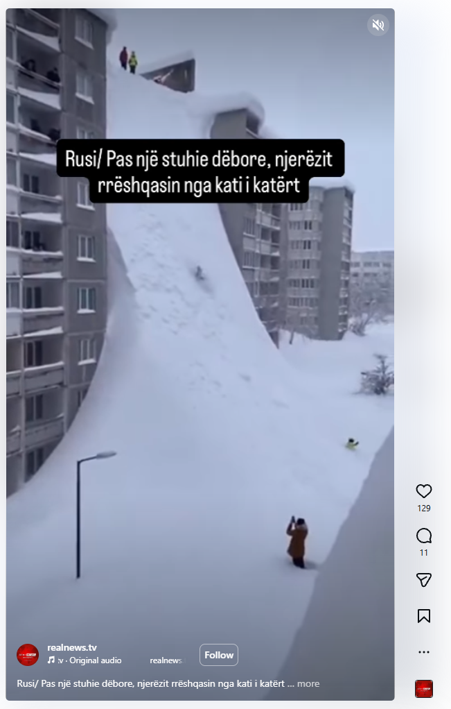 Një video që po qarkullon në rrjete sociale dhe media, përfshi ato shqipfolëse, pretendohet se tregon njerëz në Rusi duke rrëshqitur poshtë nga kati i katërt i një godine pasi një stuhi e kishte çuar nivelin e borës në lartësi ekstreme.