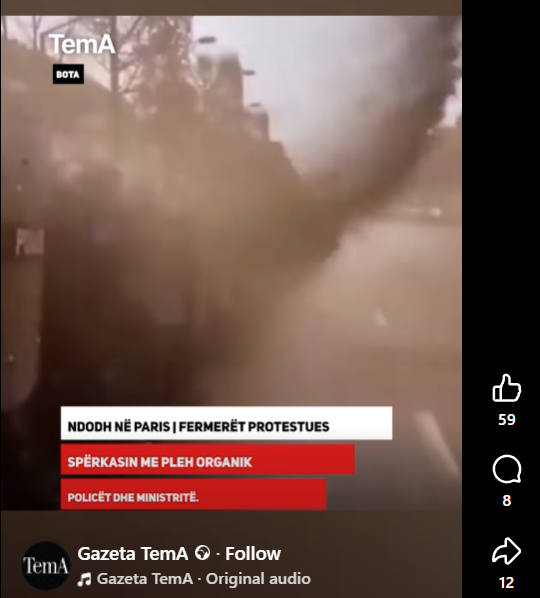 NjĂ« video qĂ« po qarkullon nĂ« rrjete sociale, pĂ«rfshi ato shqipfolĂ«se, pretendohet se tregon fermerĂ«t protestues nĂ« Paris duke spĂ«rkatur me pleh organik oficerĂ« policie.Â
