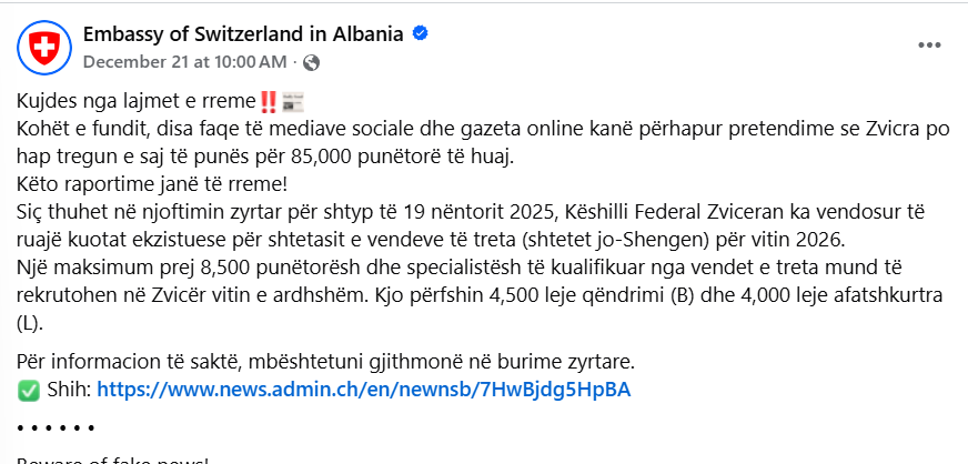 Më 21 dhjetor 2025, vetë Ambasada Zvicerane në Shqipëri i përgënjeshtroi lajmet me anë të një postimi në Facebook.