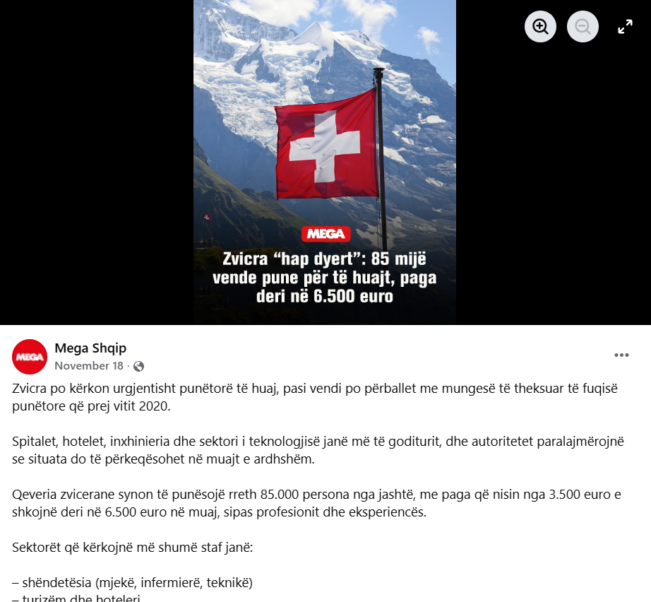 Agjencia zvicerane e punĂ«simit Adecco citohet shpesh nĂ« artikuj. Shifra shfaqet nĂ« njĂ« njoftim pĂ«r shtyp tĂ« kompanisĂ«, por nĂ« njĂ« kontekst krejtĂ«sisht tĂ« ndryshĂ«m. NĂ« shkurt 2024, Adecco u zotua tĂ« rekrutonte 85 mijĂ« refugjatĂ« dhe tĂ« trajnonte 17 mijĂ« njerĂ«z nĂ« tĂ« gjithĂ« botĂ«n deri nĂ« fund tĂ« vitit 2027. Nuk ka lidhje tĂ« drejtpĂ«rdrejtĂ« me ZvicrĂ«n dhe mungesĂ«n e saj tĂ« madhe tĂ« fuqisĂ« punĂ«tore tĂ« pĂ«rmendur nĂ« artikuj. NjĂ« tjetĂ«r origjinĂ« mund tĂ« jetĂ« nga njĂ« raport i agjencisĂ« sĂ« rekrutimit Dynajobs, e cila pĂ«rmendet nĂ« njĂ« artikull tĂ« 2022 nĂ« Blick. Kompania me seli nĂ« Aargau pretendon tĂ« jetĂ« aktive nĂ« ndihmĂ«n dhe trajnimin e rekrutimit. Ekspertiza e saj mbetet e vĂ«shtirĂ« pĂ«r tâu pĂ«rcaktuar. PĂ«r shembull, asnjĂ« klient nuk Ă«shtĂ« i listuar nĂ« faqen e internetit tĂ« kompanisĂ«. NĂ« janar 2022, drejtori i Dynajobs publikoi njĂ« analizĂ« tĂ« tregut tĂ« punĂ«s pas pandemisĂ«, nĂ« tĂ« cilĂ«n ai vlerĂ«soi se ZvicrĂ«s i mungonin afĂ«rsisht 85 mijĂ« punĂ«torĂ« tĂ« kualifikuar pĂ«r tĂ« arritur nivelet e rritjes para pandemisĂ«. ĂshtĂ« e vĂ«shtirĂ« tĂ« kuptohet saktĂ«sisht se si autori e nxori kĂ«tĂ« llogaritje. Shifra ekziston, por Ă«shtĂ« nxjerrĂ« plotĂ«sisht nga konteksti i saj origjinal.