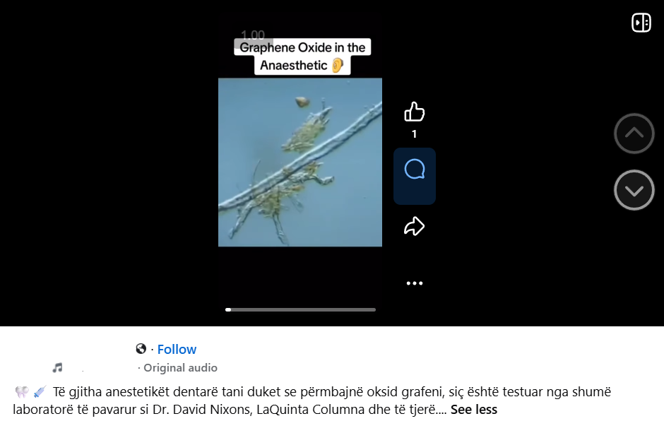 NĂ« rrjetet konspiracioniste, pĂ«rfshi ato shqipfolĂ«se, po qarkullon pretendimi se tĂ« gjithĂ« anestetikĂ«t dentarĂ« pĂ«rmbajnĂ« oksid grafeni, substanca e vendosur nĂ« shĂ«njestĂ«r qĂ« prej lindjes sĂ« vaksinave anti-Covid.Â