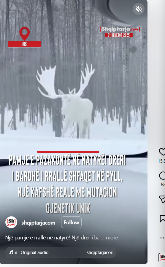 Në këto ditë të ftohta dimri ka marrë mbi 15 mijë pëlqime në Instagram një video që pretendohet se tregon një kafshë të rrallë, një dre të bardhë me mutacion gjenetik. Pamjet pretendohet se janë regjistruar në Rusi më 21 dhjetor 2025.