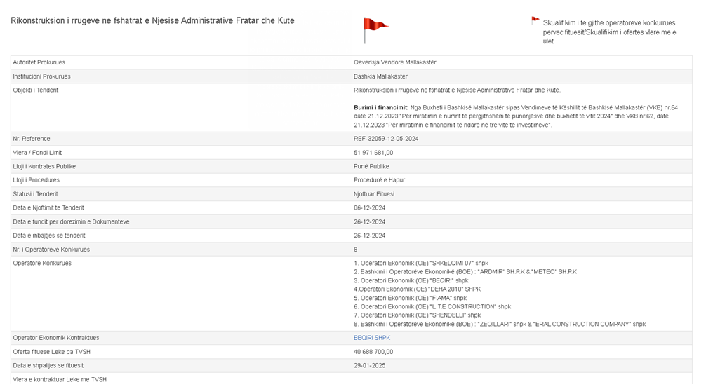 MegjithatĂ«, pazari ishte kryer nĂ« favor tĂ« “Beqiri” shpk, prandaj nĂ« 30 dhjetor 2025 Ă«shtĂ« nĂ«nshkruar kontrata dhe Ă«shtĂ« fiksuar vlera pĂ«rfundimtre totale 40 800 240,00 lekĂ« me TVSH.